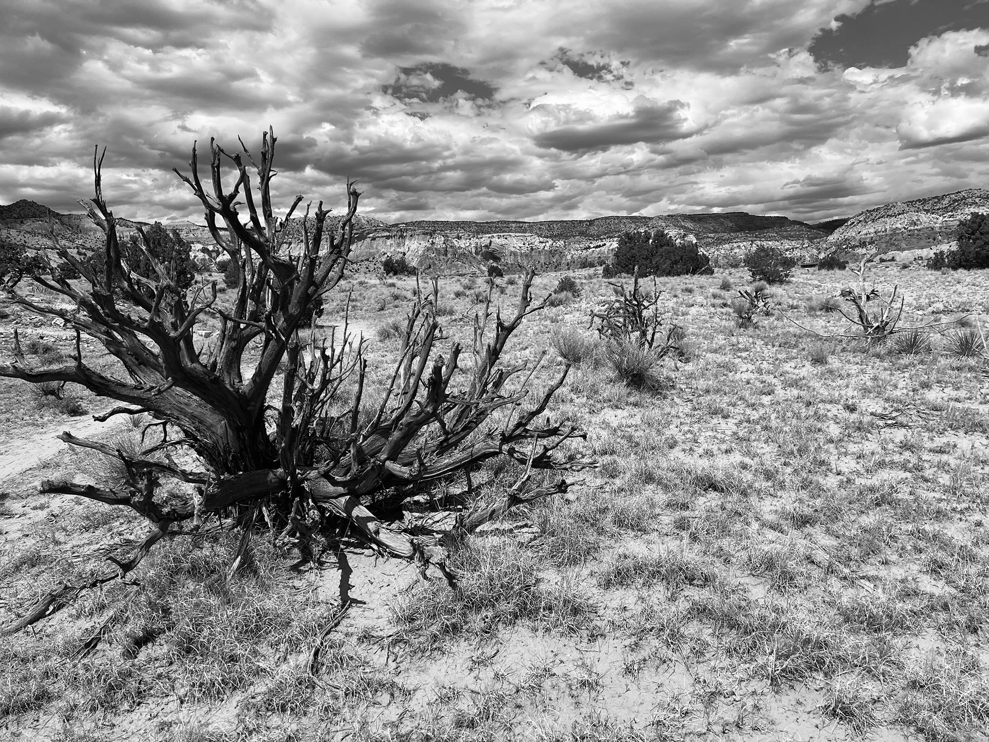 クロスモチーフを連ねた、Dennis Hoganによるシルバーカフ。 程よい厚みのスターリングシルバーに、均整の取れたスタンプワーク。 内側に残る刻印や、エッジの摩耗からは、時間を経たヴィンテージならではの表情が感じられます。 主張しすぎない中に芯のある存在感を備えた、静かな一本です。 アーティスト:Dennis Hogan 素材:スターリングシルバー(925) タイプ:オープンカフ 背景:ヴィンテージ/ナバホジュエリー サイズ:内径14cm、口径2.6cm、太さ1.3cm