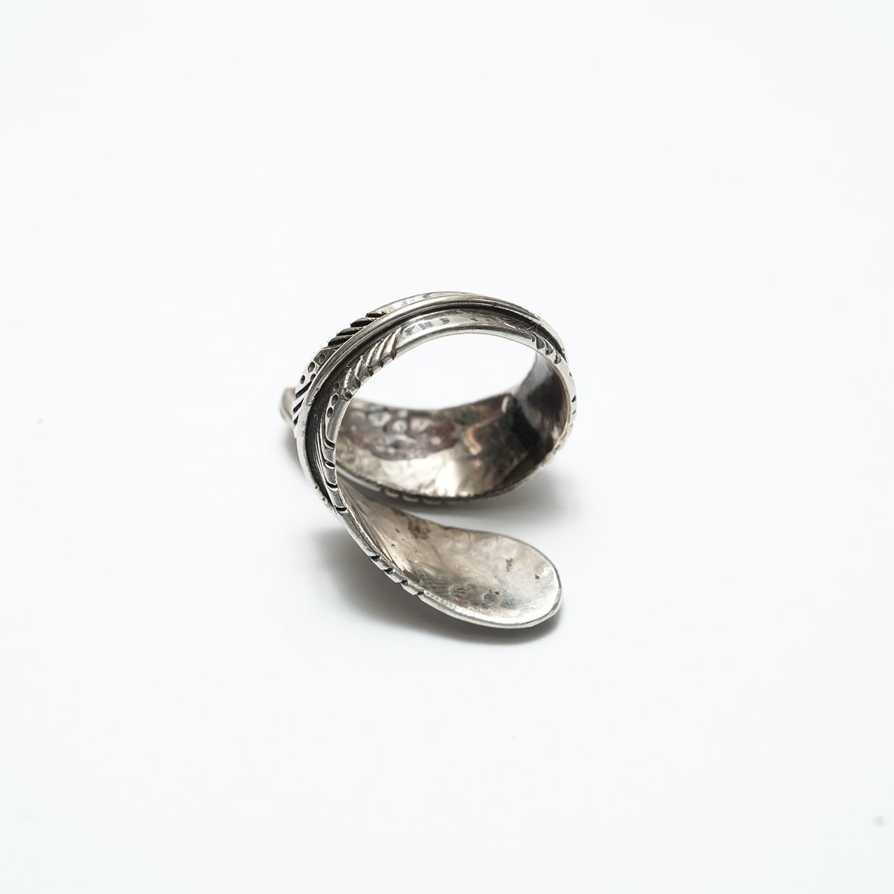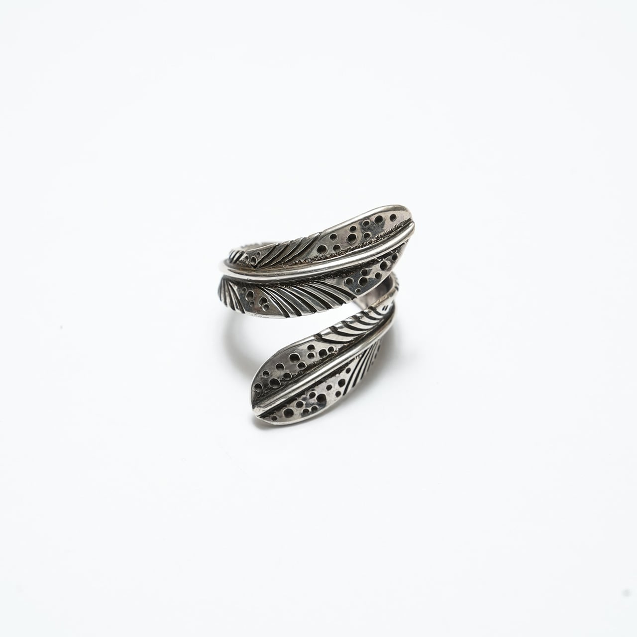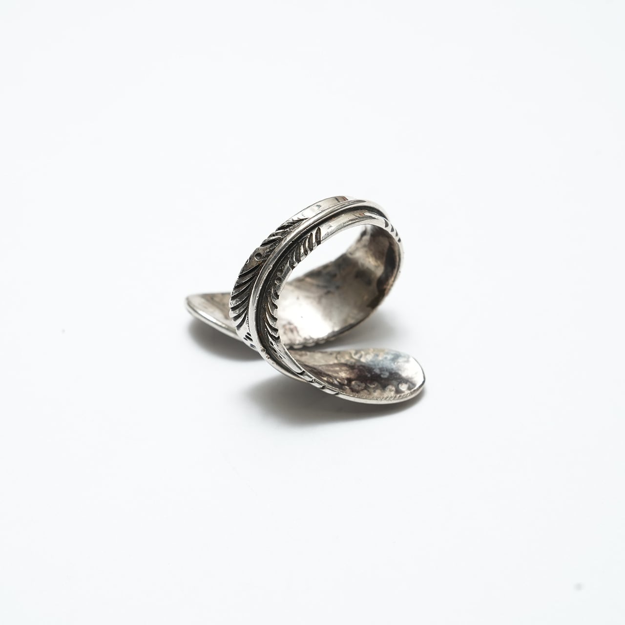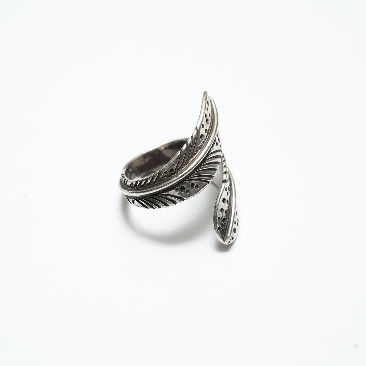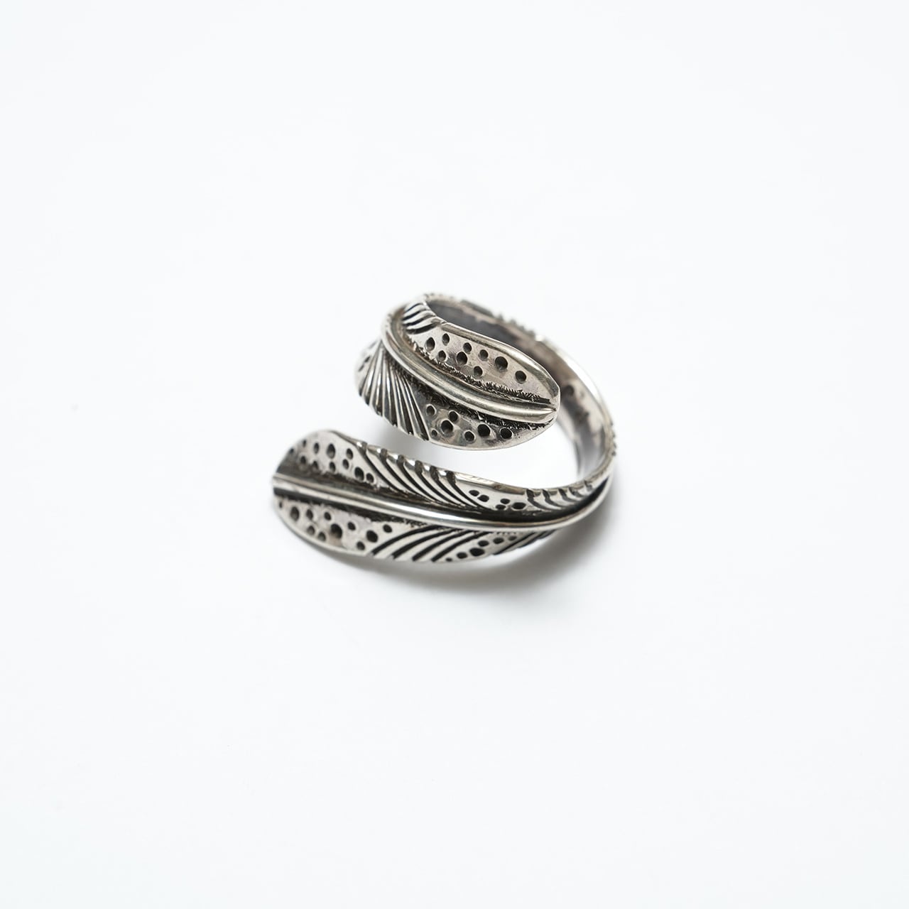 細かなスタンプワークと彫り込みによって表現されたフェザーは、動きのある造形と程よいボリューム感を併せ持ち、指元に静かな存在感を与えます。