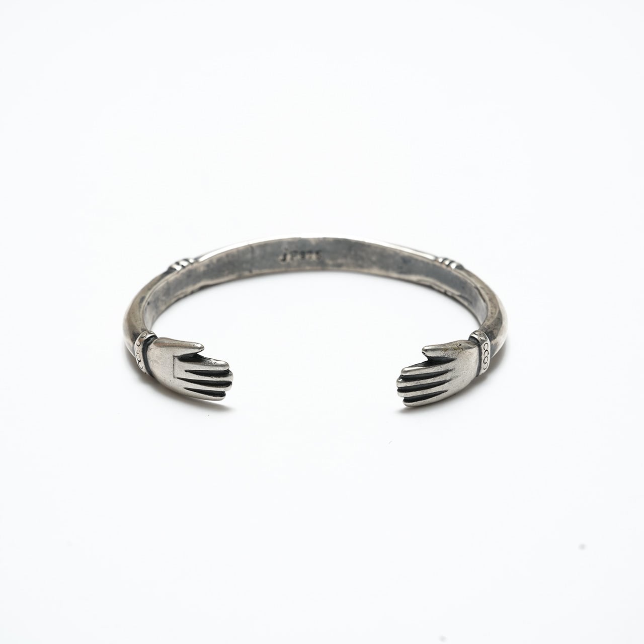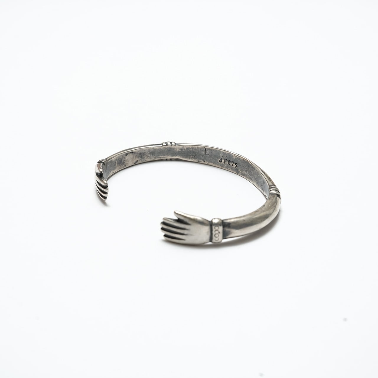 両端に向かい合う手のモチーフを配した、Jock Favourによるシルバーカフ。