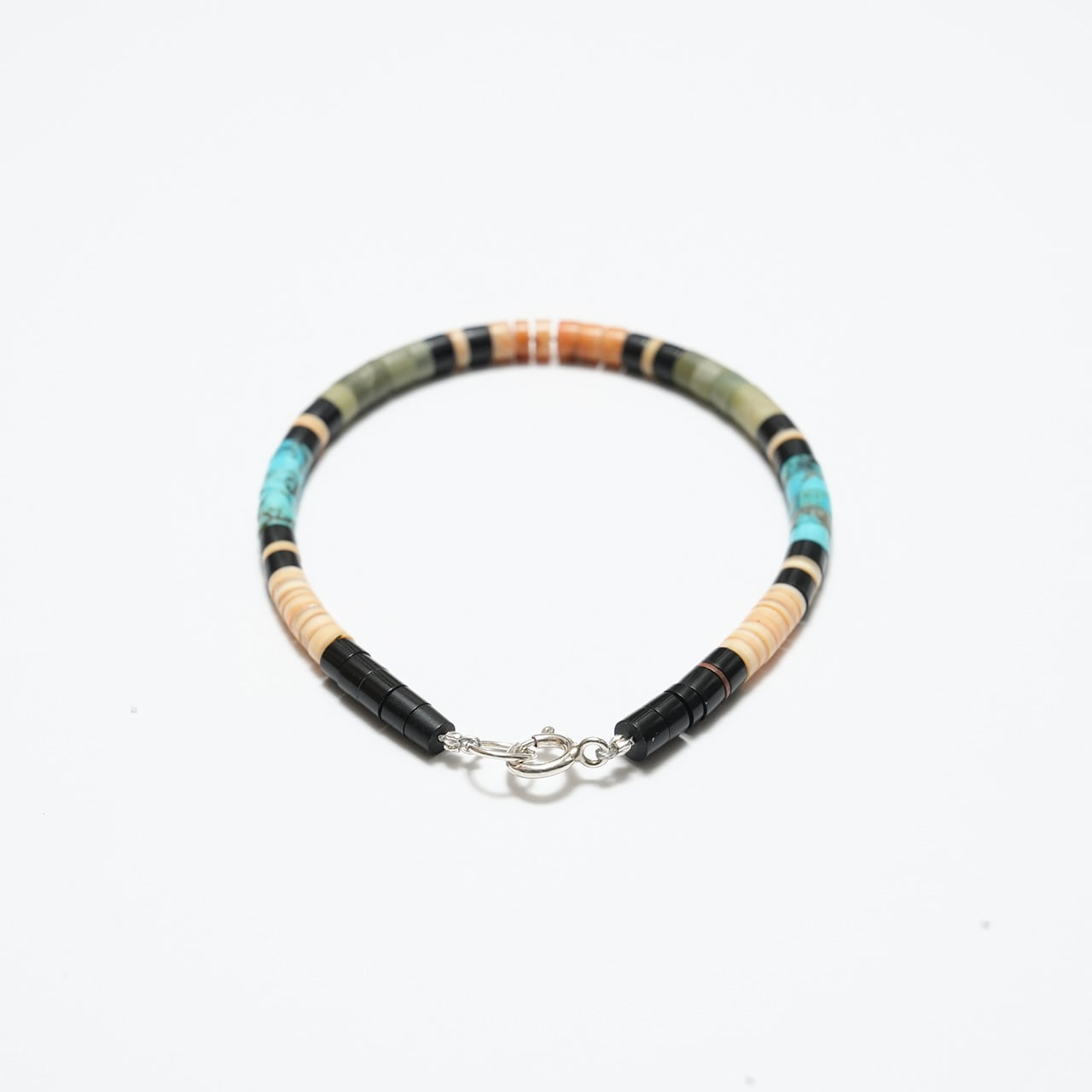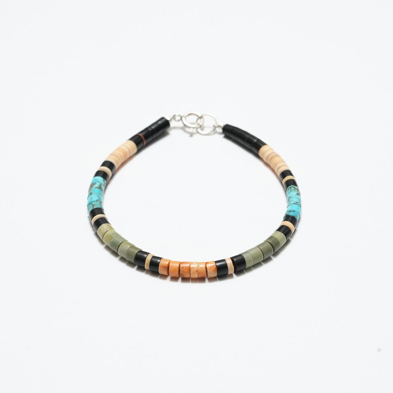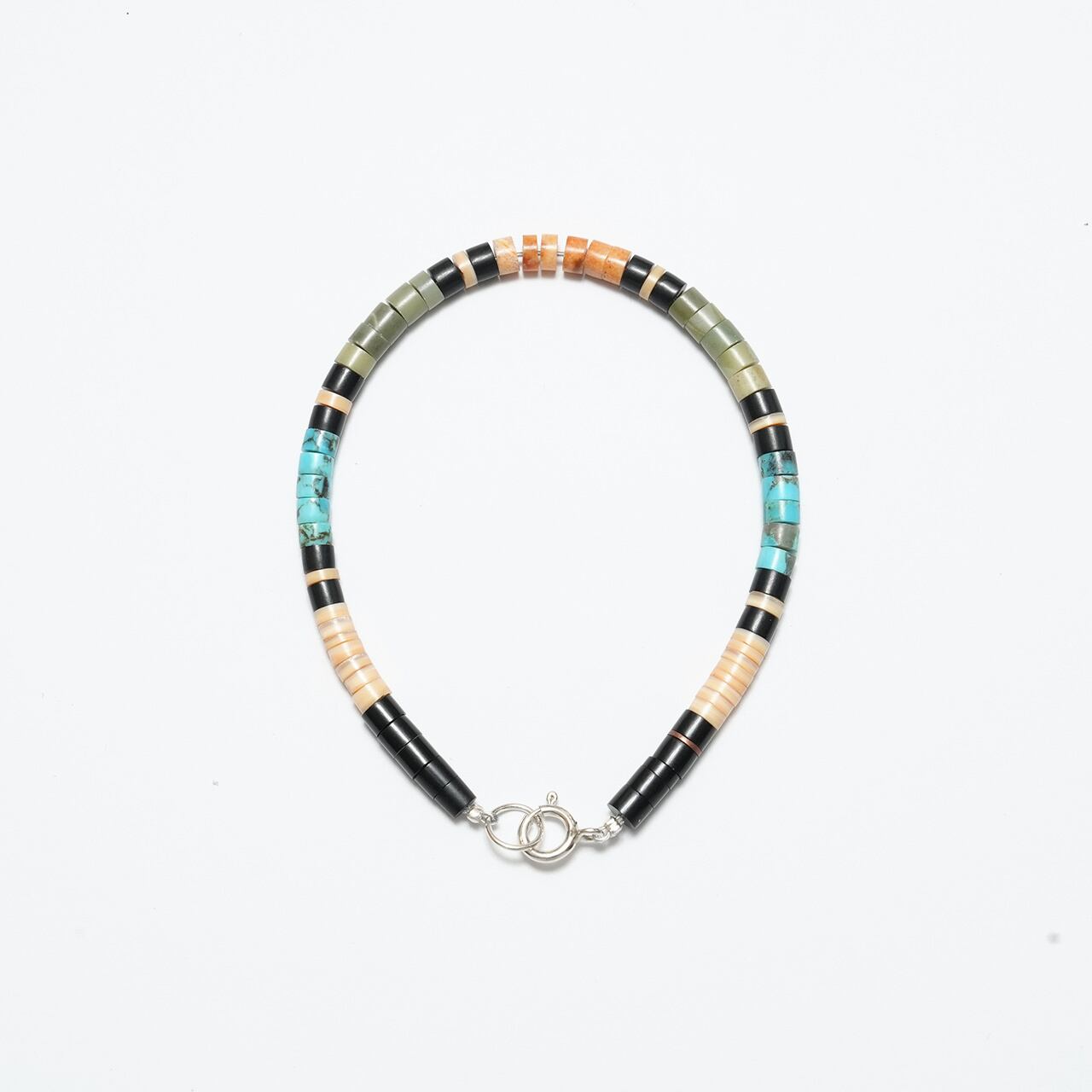 ターコイズやシェル、ジェット(ブラック)などの天然素材を用い、細やかなディスク状ビーズを一つひとつ手作業で組み上げています。